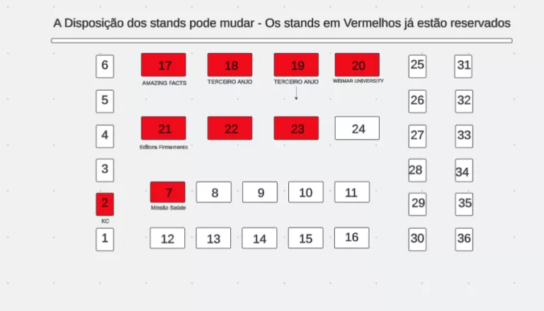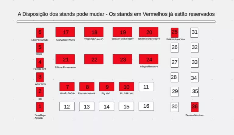 Aqui esta a disposição dos stands. de 1 a 6 e de 25 a 36 são de 3 metros quadrados (380 reais). os de 7 a 16 são de 5 metros quadrados (620 reais) e de 17 a 24 são de 8 metros quadrados (980 reais)